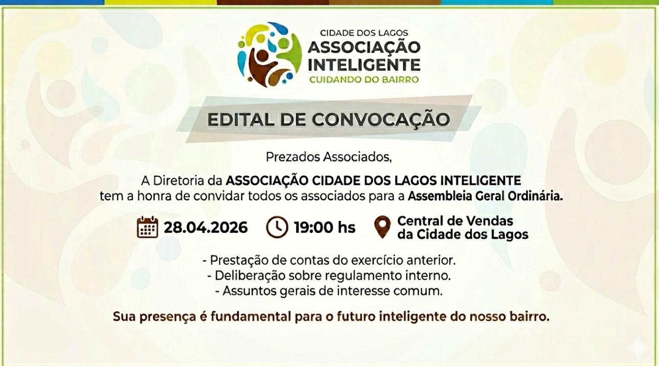 A Diretoria da Associação Cidade dos Lagos Inteligente convoca os moradores do bairro Cidade dos Lagos para participar da nossa Assembleia Geral Ordinária.
