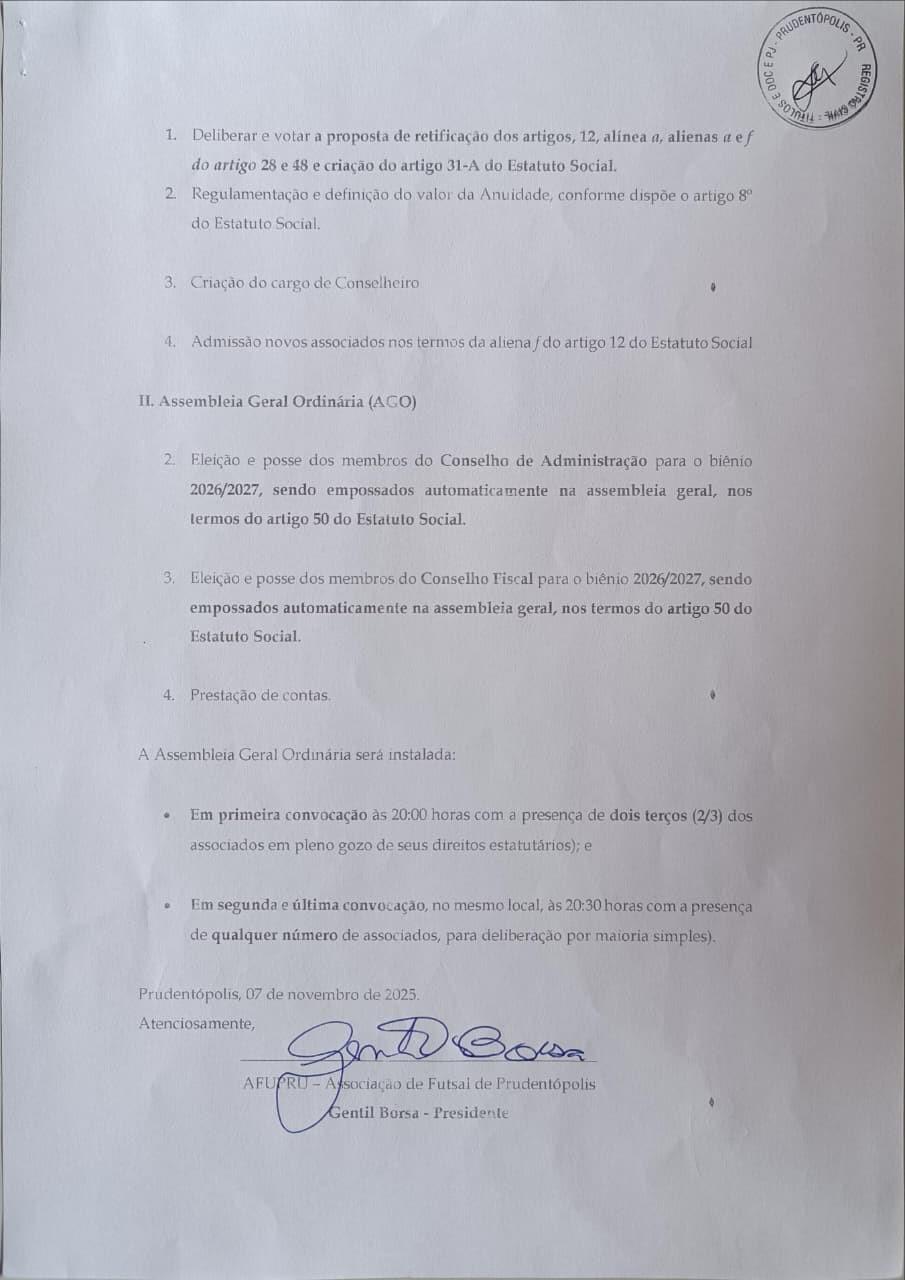 A Associação de Futsal Prudentópolis (Afupru), convoca os seus associados para as Assembleia Geral Extraordinária e Assembleia Geral Ordinária anual, a serem realizadas no endereço localizado na Rua Tiradentes, 40 - Parque Industrial, Prudentópolis - PR, 84400-000, Restaurante Iguaçu, no dia 09.12.2025.