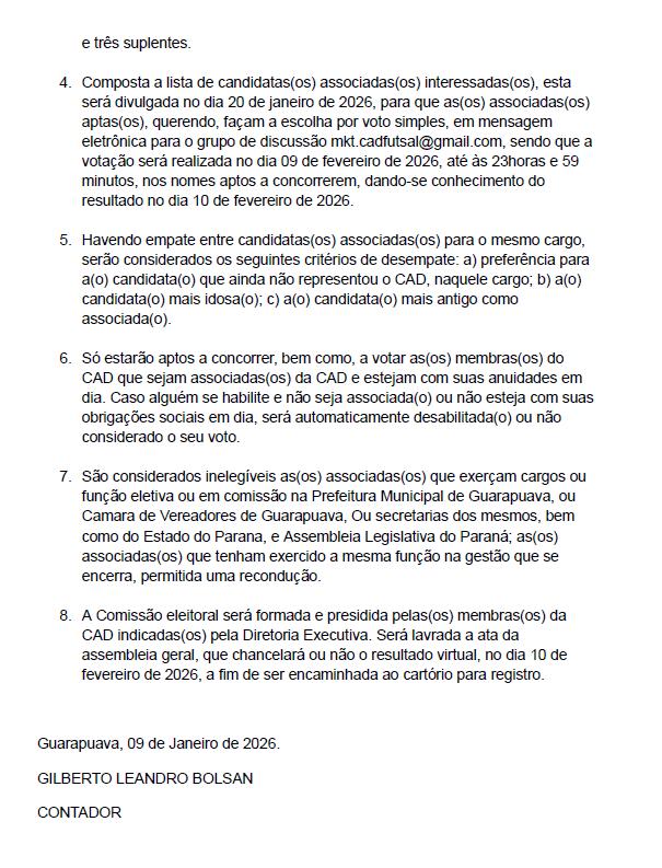 O Clube Atlético Deportivo (CAD) publicou o Edital de Convocação de Assembleia Geral para a eleição da nova Diretoria do quadriênio 2026-2029, além da apreciação de contas e deliberação sobre outros assuntos administrativos.