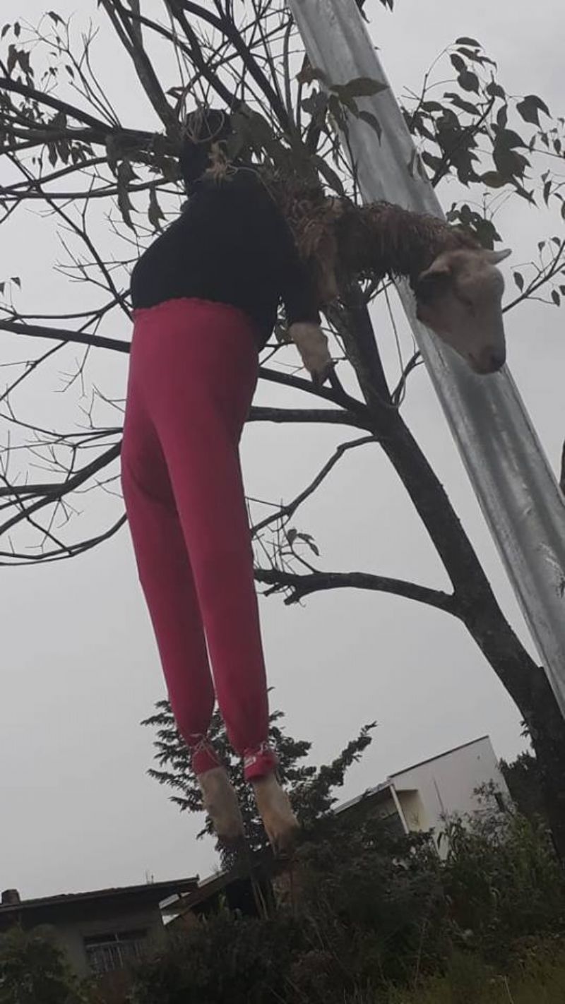 Um carneiro morto, vestido com peças de roupas e pendurado em uma árvore está causando muita revolta na população em Prudentópolis. O animal foi encontrado no alto de uma árvore na manhã desse sábado (20 de abril), na tradição da “Malhação de Judas”.