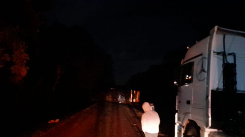 A carga de toras que estava no caminhão espalhou pela rodovia e interditou o trecho, que foi liberado após a retirada da carga da pista.
