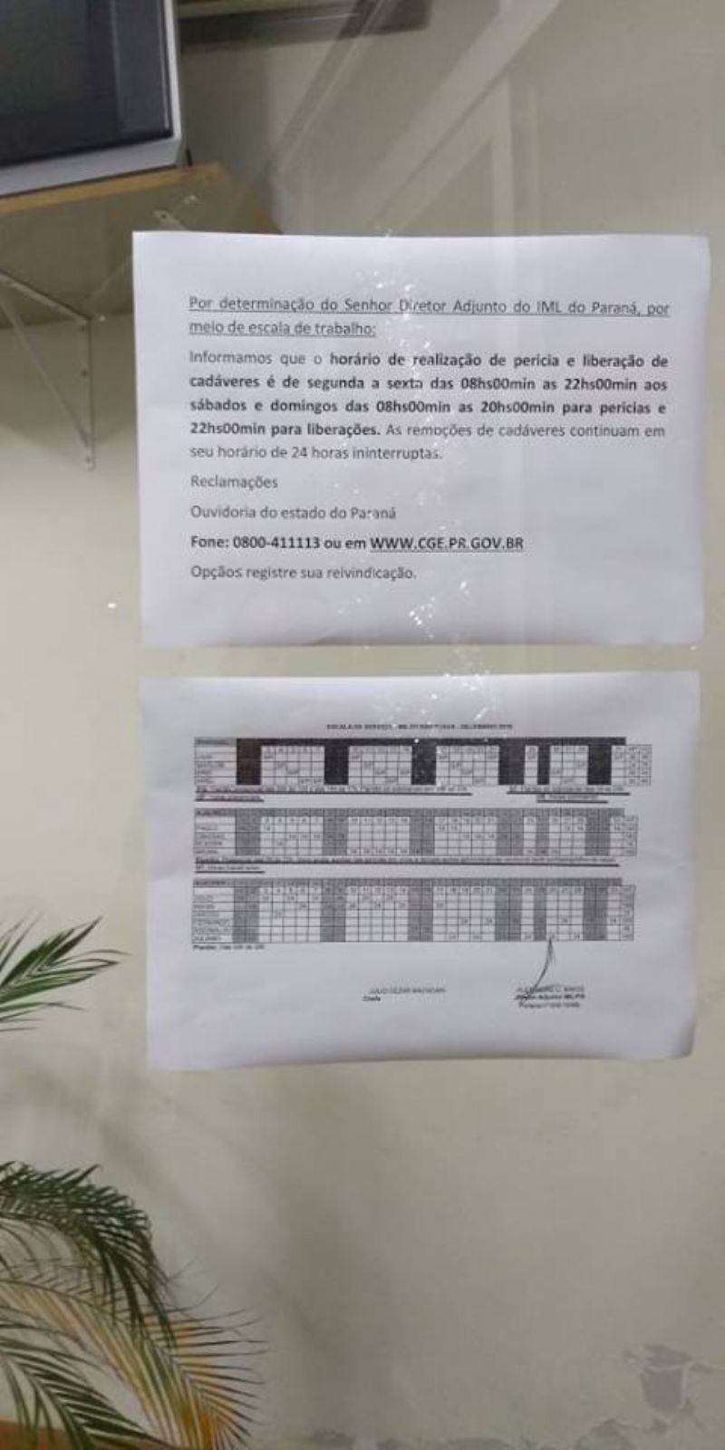 A portaria baixada pelo diretor adjunto está fixada na porta de acesso ao IML de Guarapuava (foto).