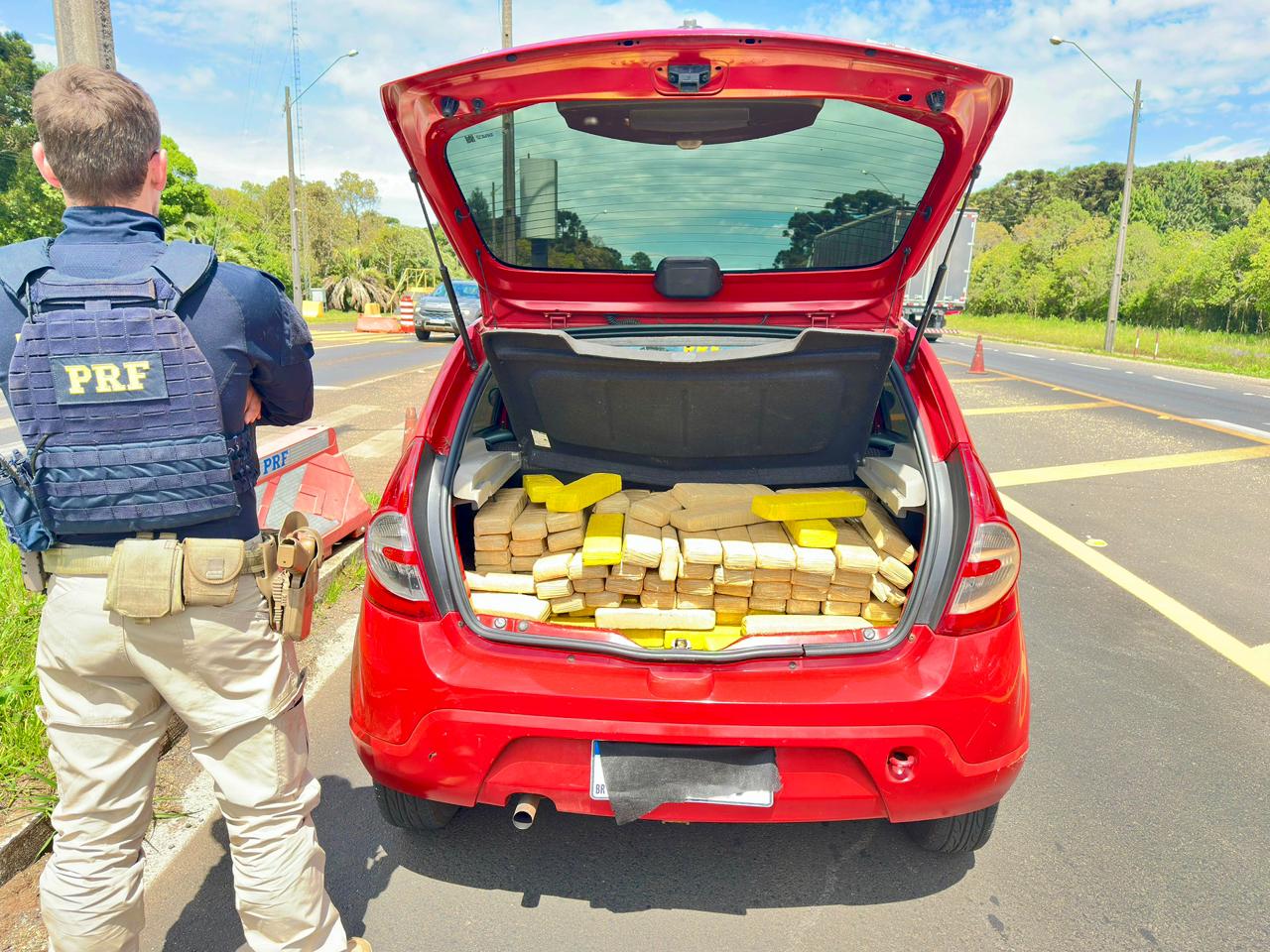 Por volta das 08h30, os policiais deram ordem de parada ao condutor de um Renault Sandero, e durante fiscalização, foram encontrados tabletes de maconha no porta-malas, totalizando 200 quilos da droga. O motorista informou que recebeu o veículo já carregado em Umuarama (PR) e que o levaria até Itajaí (SC). O motorista, o veículo e a carga foram encaminhados para a Polícia Civil de Guarapuava.