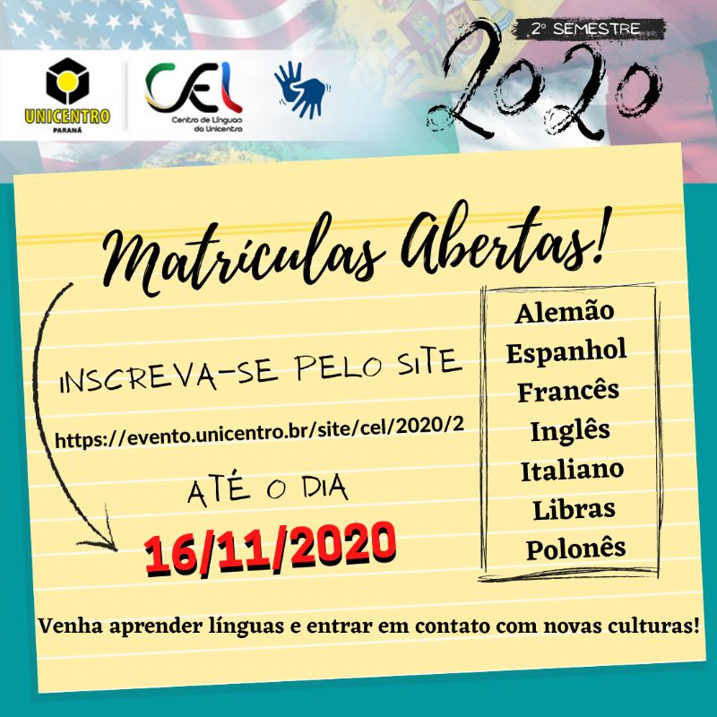Os interessados têm até o dia 16 de novembro para se inscreverem. O link de inscrição está disponível no site do Centro de Línguas, que pode ser acessado através do endereço www2.unicentro.br/cel. Cada curso do Centro de Línguas da Unicentro tem a carga horária de 45 horas-aula por semestre, sendo três horas-aula por semana. As aulas estão previstas para iniciarem no dia 23 de novembro, sendo que no final do ano terão uma pausa e retomadas em fevereiro e vão até maio de 2021.