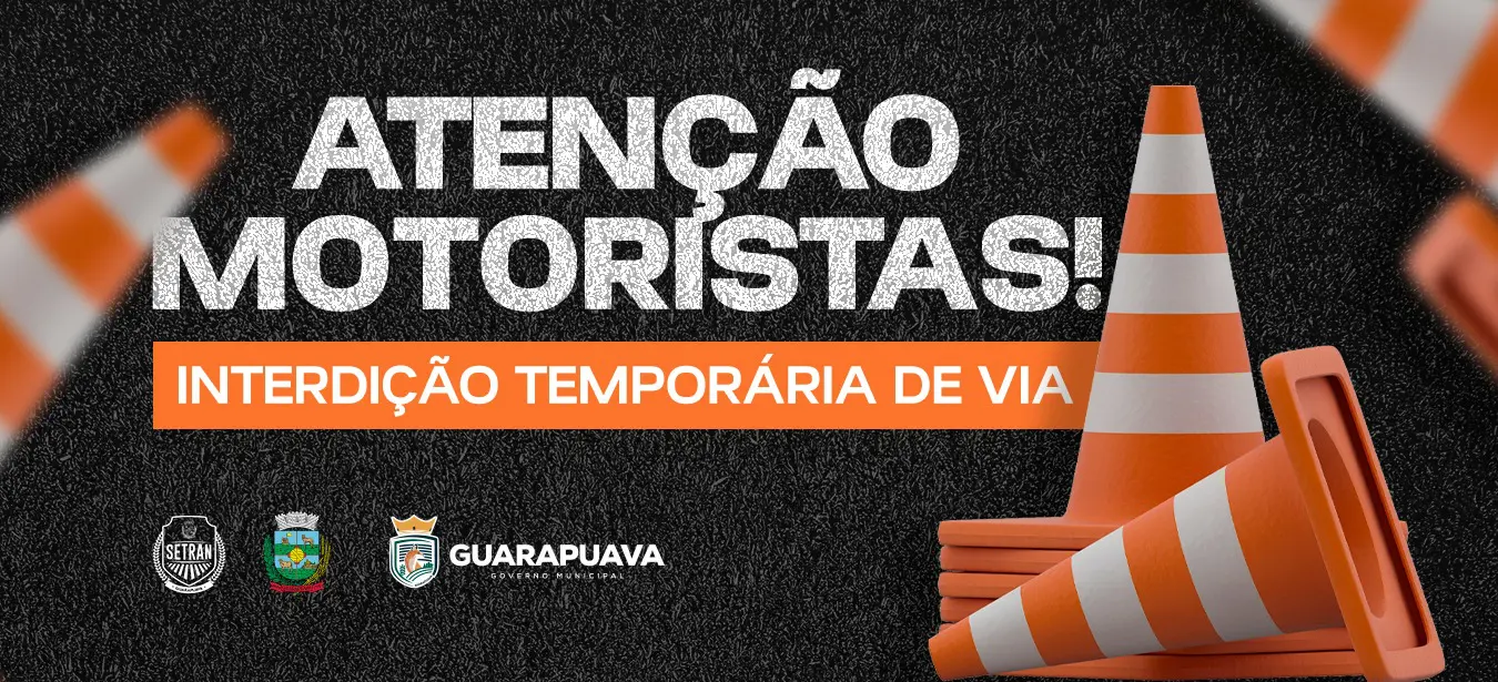 A Prefeitura de Guarapuava, por meio da Secretaria Municipal de Trânsito (Setran), informa que neste domingo (12 de outubro), das 6h às 20h, haverá interdição temporária da Rua Francisco Pires da Rocha, no trecho entre as ruas Alípio Marcondes e Rufino Pacheco.