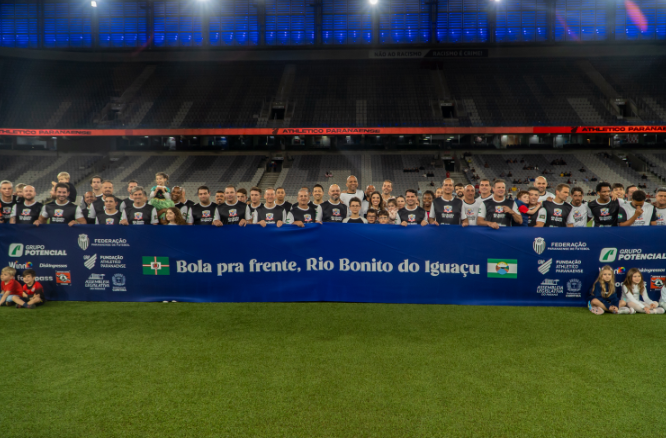 Esperança e Solidariedade. Os nomes dos dois times que entraram em campo nessa quarta-feira (19 de novembro de 2025) na Arena da Baixada, em Curitiba, já demonstram o caráter do jogo solidário “Bola pra Frente”. A partida foi promovida pela Assembleia Legislativa do Paraná (Alep) para arrecadar recursos para a cidade de Rio Bonito do Iguaçu, com a participação de jogadores que fizeram história com as camisas do Coritiba, Athletico e Paraná Clube. A partida terminou empatada em 8 a 8, mas o que mais importou foi a solidariedade da torcida e de todos os envolvidos.
