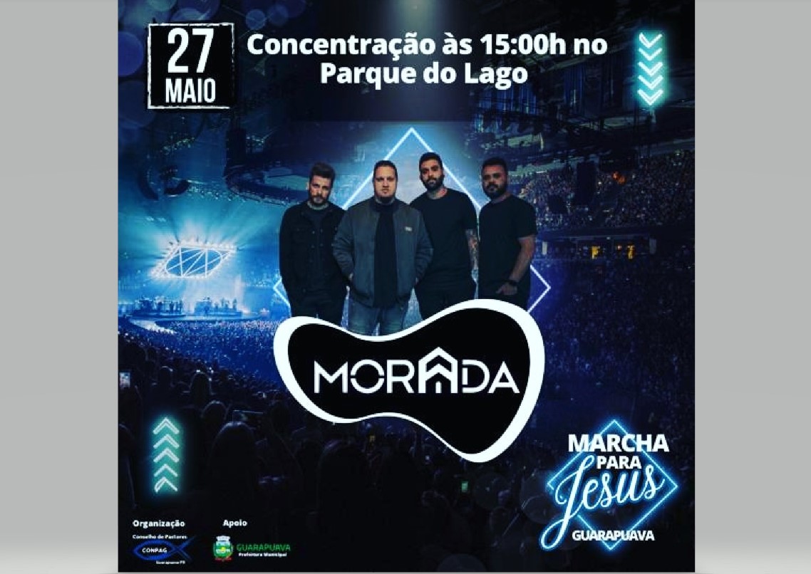 Conforme Vanderlei Mello, pastor e coordenador geral do evento, a cada ano a Marcha para Jesus Ganha força na cidade e muitas pessoas de outros municípios participam do evento cristão considerado um dos mais importantes do País. Vanderlei lembra ainda, que para celebrar os treze anos em Guarapuava, a Morada, uma das maiores bandas gospel de todos os tempos, se apresentará pela primeira vez na cidade. “Temos atividades a semana inteira, de 22 a 26 de maio, encerrando no dia 27, sábado, com muito trabalho, todos voltados para Cristo e para a população. Às 9h da manhã, no Parque do Lago, haverá o Impacto Social, com diversas atividades gratuitas para as pessoas que por lá passarem. Já às 15h, começa a concentração, em preparação para o show com a Banda Morada, considerada uma das maiores bandas gospel do País. Eles se apresentam pela primeira vez em Guarapuava e todos são convidados a participar e louvar a Deus”, destaca Vanderlei.