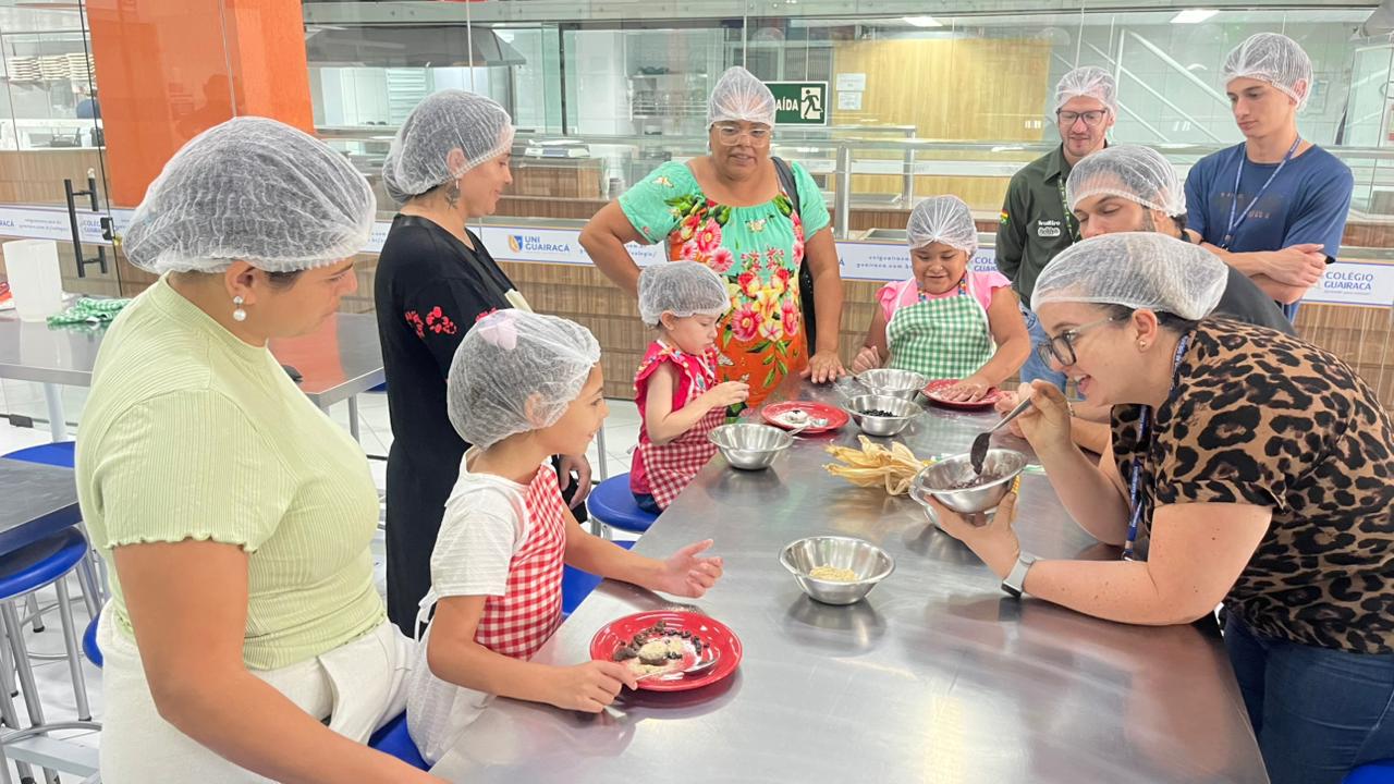 A atividade foi realizada na cozinha escola da Universidade UniGuairacá, proporcionando um ambiente diferenciado para o desenvolvimento das oficinas.