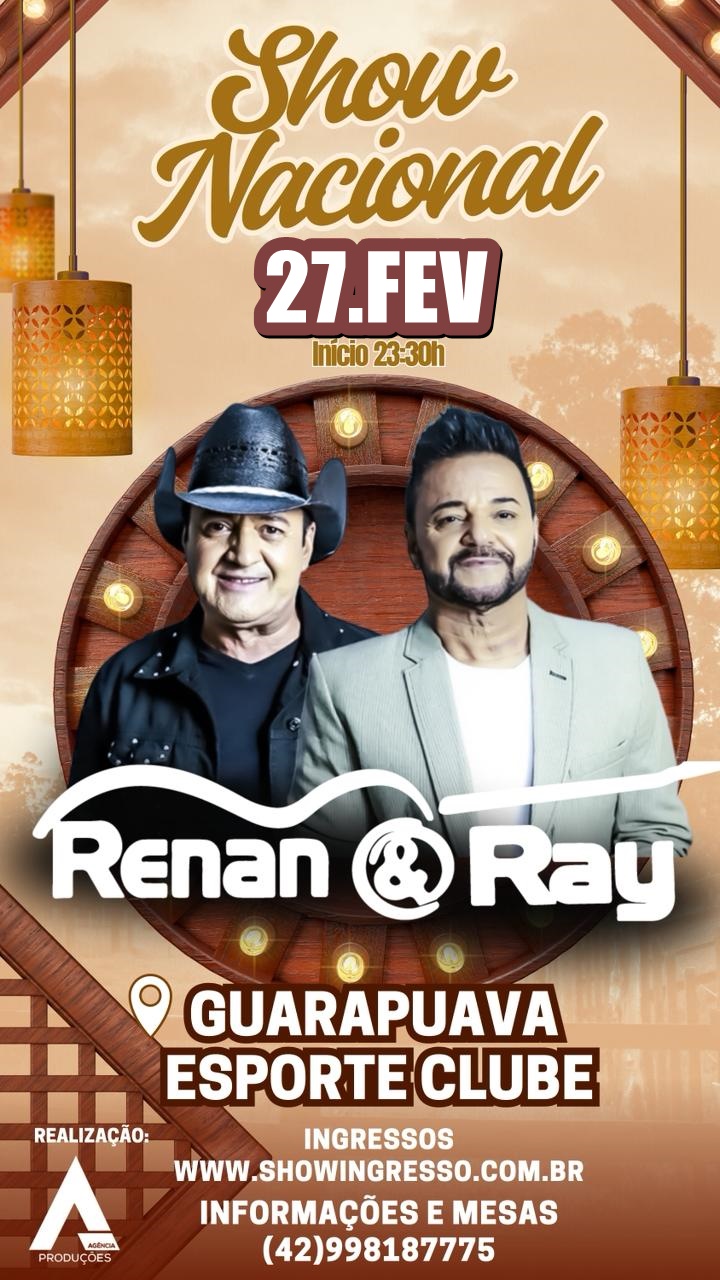 #RenanERay #GmaisNoticias #ShowNacional #LançamentoDeDVD #Sertanejo #Guarapuava #EventoEmGuarapuava #GuarapuavaEsporteClube #MurilloSouzaEVinícius #AgendaCultural #Sertanejo2026