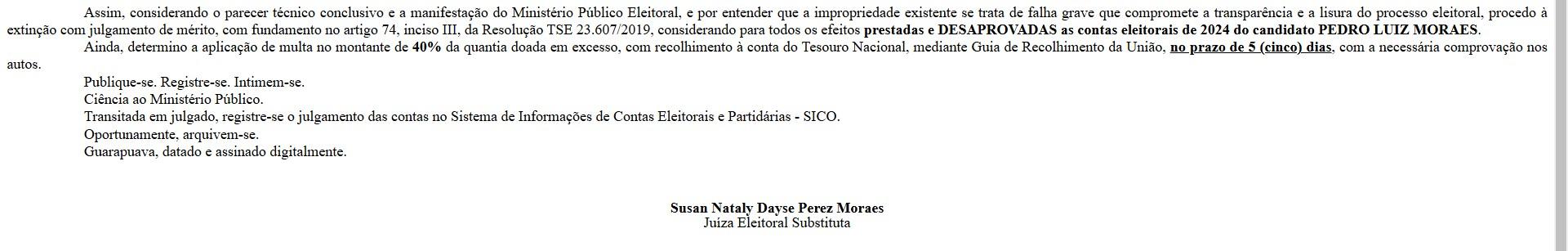 Como antecipou o Gmais Notícias na última segunda-feira (11 de novembro), a Justiça Eleitoral confirmou e proferiu sentença (VEJA ABAIXO) na tarde desta quarta (13) desaprovando as contas da campanha eleitoral do atual presidente da Câmara de Vereadores de Guarapuava, Pedro Moraes. (LEIA AQUI SOBRE O CASO)