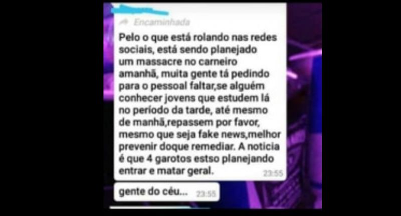 Usando de forma negativa os casos ocorridos em Suzano (SP), onde 10 pessoas morreram em um ataque a uma escola, e o recente caso de um Youtuber que entrou em um colégio em Guarapuava para jogar vídeo game com o irmão, expondo a fragilidade de acesso às escolas, uma mensagem que começou a circular no final da tarde de ontem alerta para um suposto ataque a estudantes no Colégio Carneiro (entende-se que seja o Colégio Carneiro Martins, no Centro da cidade).