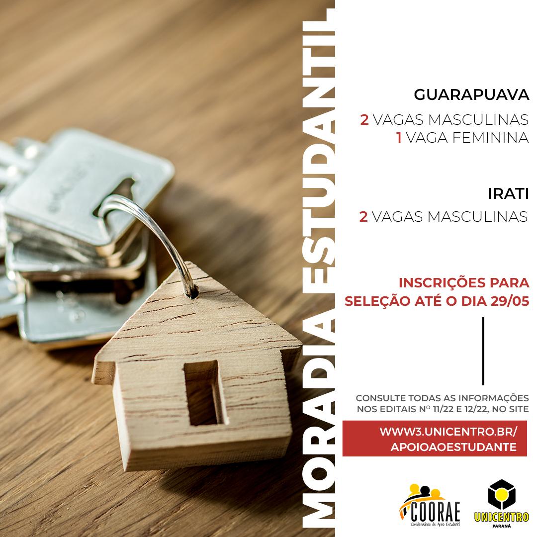 A Coordenadoria de Apoio ao Estudante (Coorae) está com editais abertos para selecionar novos residentes para as Moradias Estudantis da Unicentro em Guarapuava e em Irati. Nesse momento, são cinco vagas em aberto. Segundo a assistente social da Coorae, Etiene Rabel Corso, “as vagas de moradia são destinadas exclusivamente aos discentes de graduação regularmente matriculados em um dos cursos de graduação presencial da Uncientro nos campi Ssnta Cruz, Cedeteg e Irati”.