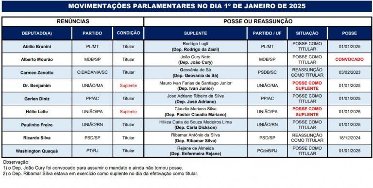 Nove deputados federais renunciaram na quarta-feira (1º de janeiro) a seus mandatos para assumir o cargo de prefeito – sete titulares e dois suplentes no exercício do cargo. São eles: